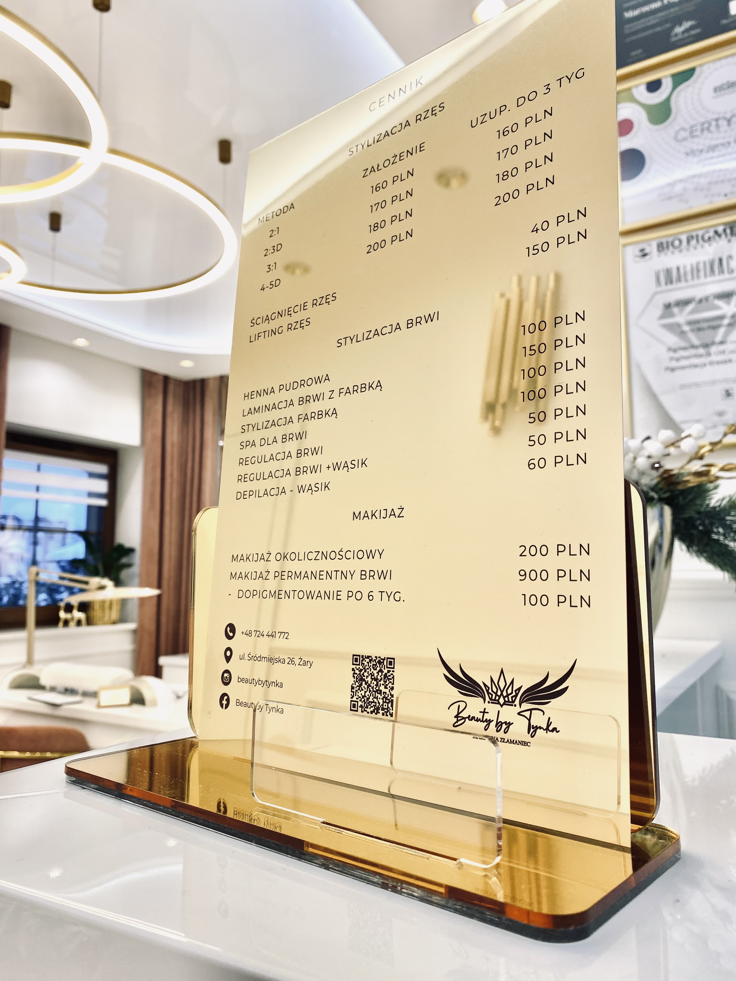Lustrzany cennik, który nie tylko informuje, ale i buduje wizerunek Twojej marki. Lustrzane wykończenie dodaje elegancji wnętrzu, a projekt graficzny przygotowujemy bezpłatnie pod Twoje usługi.